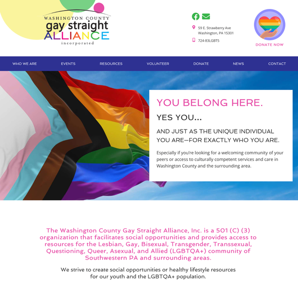 Washington County Gay Straight Alliance, Inc. is dedicated to affirming acceptance between diverse groups of people, raising awareness in our community of the needs of Lesbian, Gay, Bisexual, Transgender, Transsexual, Questioning, Queer, Asexual, and Allied (LGBTQA+) people through support, education, and community outreach on the issues of diversity.